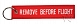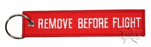 Breloczek z haftowanym wizerunkiem samolotu North American P-51 Mustangna jednej stronie, a na drugiej napis REMOVE BEFORE FLIGHT (RBF Tag).