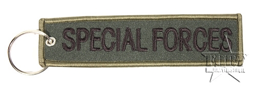 Breloczek z haftowanym napisem SPECIAL FORCES na obydwu stronachoraz z metalowym kółkiem np. do kluczy - o średnicy 4 cm.