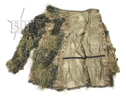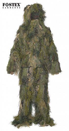 Ghillie Suit - snajperski, kompletny strój maskujący w kamuflażu leśnym woodland. Doskonały dla strzelców wyborowych, do fotografowania zwierząt w naturalnym środowisku, do polowań, itp.