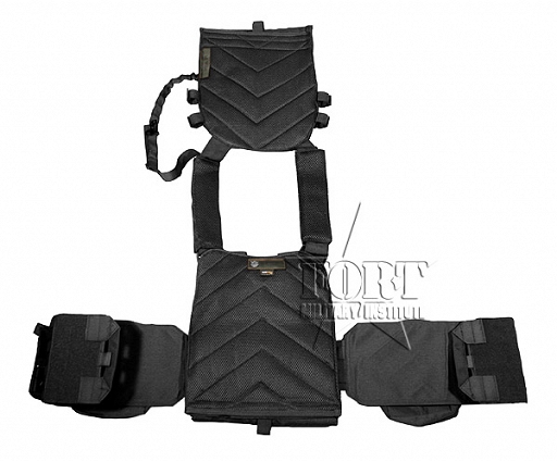 Otwieranie z przodu na rzepy, regulacja z tyłu również na rzepy. Regulowane pasy naramienne. Miękka wewnętrzna wyściółka. Paski montażowe systemu Molle z przodu, po bokach i z tyłu. Elastyczny, jednopunktowy pas do broni z karabińczykiem (bungee sling) mocowany do pasów naramiennych. Kieszenie z przodu i z tyłu na panele balistyczne (kamizelka nie zawiera paneli balistycznych, jedynie miękki wypełniacz). Usztywnione boki. 5 ładownic otwartych na magazynek M16/M4 (STANAG AR-15). Magazynek jest zabezpieczony od góry elastyczną linką. Dwie duże uniwersalne kieszenie EMT (apteczki). 2 uchwyty na np. latarkę. Uchwyt na plecach.