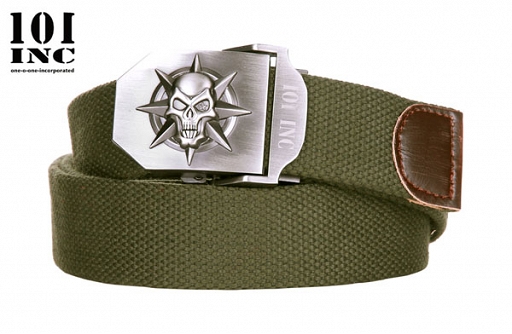 Pas do spodni, parciany w kolorze zielonym. Klamra z metalu ze stylizowanym emblematem czaszki i gwiazdy.