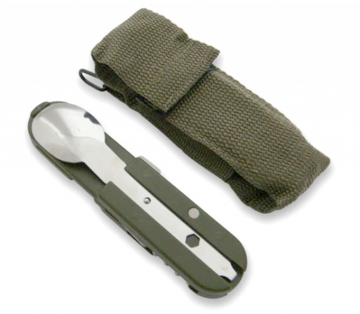 Niezbędnik wojskowy typ francuski. Nóż z blokadą, widelec, łyżka, otwieracz do puszek, otwieracz do butelek, korkociąg, śrubokręt płaski na końcu łyżki.
