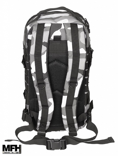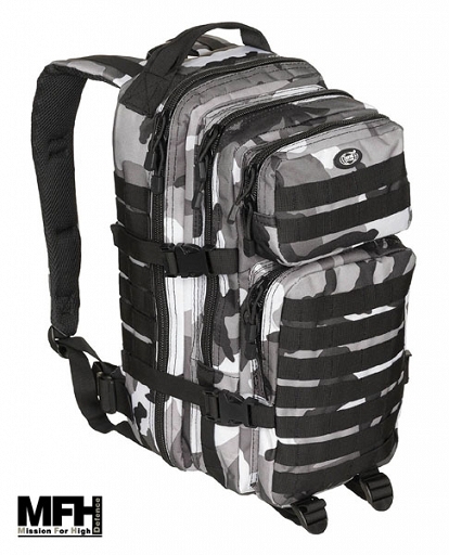 Wygodny i praktyczny plecak w kamuflażu miejskim urban camo. Pojemność około 20 litrów.