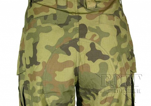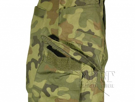 Spodnie Special Forces w kamuflażu leśnym Wojska Polskiego. Wykonane z bawełny z zastosowaniem technologii RipStop. Produkt renomowanej firmy Helikon. Spodnie w kroju Special Forces posiadają 9 kieszeni, dwie z przodu, dwie z tyłu zapinane na rzep, dwie typu cargo po bokach zapinane na patki z rzepami, jedna na prawej nogawce na wysokości kolana zapinana na patke z rzepem oraz dwie małe kieszonki z przodu, idealnie nadające się do przechowywania niewielkich przedmiotów np. telefonu komórkowego. Spodnie posiadają wzmocnienia na kolanach i z tyłu. Szerokoie nogawki zapewniają wygodę użytkowania oraz doskonałą cyrkulację powietrza, dzięki czemu są komfortowe również w gorące dni. Końce nogawek wykończone zaszewkami z tasiemkami ściągającymi. Obwód w talii można regulować za pomocą ściągacza.