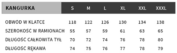 Tabela rozmiarów poniżej. Wartości są podane w centymetrach.