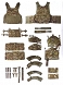 1 szt. Kamizelka część przednia i tylna z regulacją w ramionach i w biodrze. Kieszenie na płyty balistyczne w części przedniej i tylnej, Na części przedniej i tylnej naszyte paski montażowe do dopinania oporządzenia w systemie MOLLE.