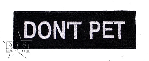 Haftowana naszywka dla psa służbowego (K-9) DON'T PET (nie głaskać).Tło czarne, biały napis.Wymiary: 11,5 cm x 3,5 cm.Mocowanie: Na rzep.