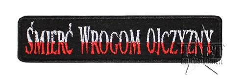 Tło i ramka czarne, napis dwukolorowy biało-czerwony.