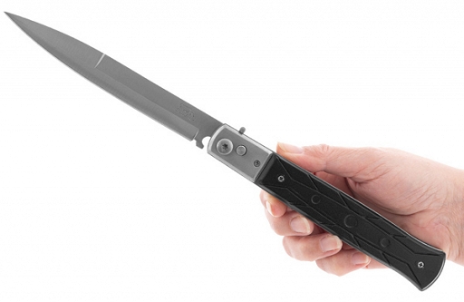 Błyskawiczny nóż sprężynowy z długim ostrzem, z blokadą, ostrze o profilu Spear Point. Rękojeść zdobiona, ze stali, z czarnymi okładzinami. Otwarcie za pomocą przycisku (po zwolnieniu blokady) jest szybkie i płynne. Blokada typu plunge lock zabezpiecza przed niechcianym otwarciem, a w pozycji otwartej przed niechcianym zamknięciem. Pokrowiec z czarnej cordury, ma szlufkę do mocowania np. do pasa.