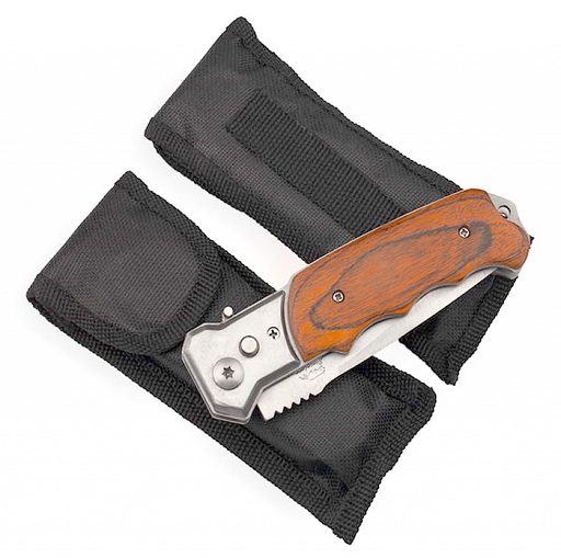 Błyskawiczny nóż sprężynowy to doskonałe narzędzie na każdą okazję. Na grzbiecie znajduje się wygodne karbowanie pod kciuk, rewelacyjne podczas pracy wymagającej użycia większej siły nacisku. Ergonomiczna rękojeść została obłożona drewnianymi obiciami. Świetnie leży w dłoni i jest wygodny w użyciu. Otwieranie następuje za pomocą intuicyjnego przycisku i przebiega płynnie i ekspresowo. Wyposażony w blokadę typu plunge lock, która zabezpiecza nóż przed niepożądanym otwarciem, a w pozycji zamkniętej przed schowaniem się ostrza. W tylnej części znajduje się otwór przez który można przewlec linkę, sznurek lub breloczek. Dodatkowo w zestawie znajduje się czarny pokrowiec z cordury ze szlufką do mocowania np. do pasa.