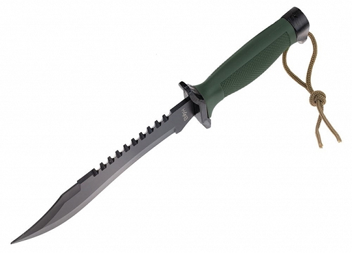 Niezawodny nóż taktyczny typu RAMBO (Jungle King), to idealna broń do zadań bojowych, survivalowych czy outdooru. Świetnie wykonane, solidne narzędzie dla wymagających użytkowników. Masywna głownia o profilu Recurve Bowie z pofalowaną krawędzią tnącą, wykonana ze stali nierdzewnej typu 420, którą pokryto dodatkową powłoką ochronną w kolorze czarnym. Taka oksydacja nadaje charakteru, podnosi właściwości antykorozyjne i niweluje niechciany odblask. Nóż taktyczny został wyposażony w dwurzędową piłę umiejscowioną na grzbiecie. Ergonomiczna rękojeść wykonana z tworzywa sztucznego o chropowatej teksturze, które ma właściwości antypoślizgowe, jest bardzo wygodna, świetnie leży w dłoni i zapewnia stabilny chwyt. W tylnej części znajduje się otwór przez który przywleczono linkę. Tęgi, metalowy jelec skutecznie chroni dłoń przed zsunięciem się w stronę krawędzi tnącej podczas wykonywania pracy. W zestawie znajduje się pokrowiec z tworzywa, który można przymocować do paska spodni.