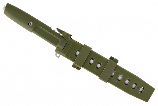 Klasyczny nóż wojskowy ma idealne rozmiary i rewelacyjnie sprawdzi się w każdych okolicznościach. Budowa typu Hidden Tang to gwarancja niezwykłej wytrzymałości i odporności na jakiekolwiek uszkodzenia. Głownia o profilu Clip Point ma ostrze gładkie zakończone uniwersalnym szpicem. Wewnętrzy monolit tworzy wysokojakościowa stal nierdzewna 440, która gwarantuje długie zachowanie ostrości. Ergonomiczna rękojeść została wykonana z gumopodobnego tworzywa, które świetnie leży w dłoni i zapobiega poślizgom. Jednostronny jelec skutecznie chroni przed zsunięciem się w stronę krawędzi tnącej, a karbowanie na grzbiecie pozwala na wygodne ułożenie kciuka podczas prac wymagających użycia siły. Z tyłu noża znajduje się wypustka, służąca jak zbijak do szyb. W zestawie znajduje się zielona pochwa z twardego tworzywa, który można łatwo przymocować do paska spodni.