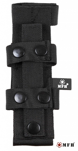 Zapinany na klapkę z rzepem. Elastyczne paski po bokach do regulacji rozmiaru. 1 wsuwana komora z zapięciem na rzepy z tyłu (np. na nożyczki medyczne). Z tyłu paski montażowe Molle do mocowania w pionie i w poziomie np. do pasa, torby medycznej lub plecaka wyposażonych w paski systemu Molle.