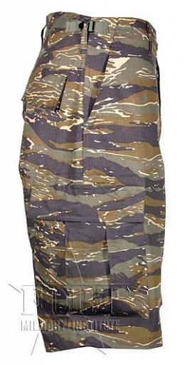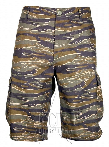 Spodenki w kamuflażu Tiger Stripe, zaadoptowanym przez US ARMY od wojsk lokalnych podczas wojny w Wietnamie. Krój BDU, ripstop. Posiadają 6 kieszeni, dwie przednie, dwie tylne z prostokątnymi patkami zapinanymi na dwa guziki oraz dwie duże boczne kieszenie typu cargo zapinane na guziki. Rozporek spodni zapinany na guziki. Spodenki mają regulację w pasie, ściągając paski można je zmniejszyć o 10 cm w obwodzie.