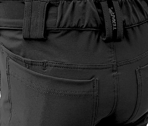 Wzmocniona krawędź przednich kieszeni. Szerokie i mocne szlufki.