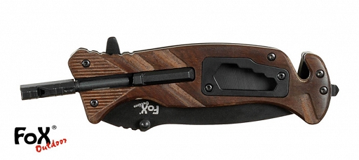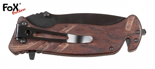 Kompaktowy nóż otwierany jedną ręką. Czarne ostrze ze stali 3Cr13 z blokadą i z rowkowanym podparciem kciuka oraz z obustronnym kołkiem na kciuk. Rękojeść metalowa z drewnianą okładziną, z jednej strony metalowy klips do zamocowania noża np. do pasa a z drugiej wbudowany klucz oczkowy w 4 rozmiarach. W rękojeści krzesiwo w sztyfcie z gwizdkiem ratunkowym. Na końcu rękojeści wybijak do szyb i nóż do przecinania np. pasów bezpieczeństwa.