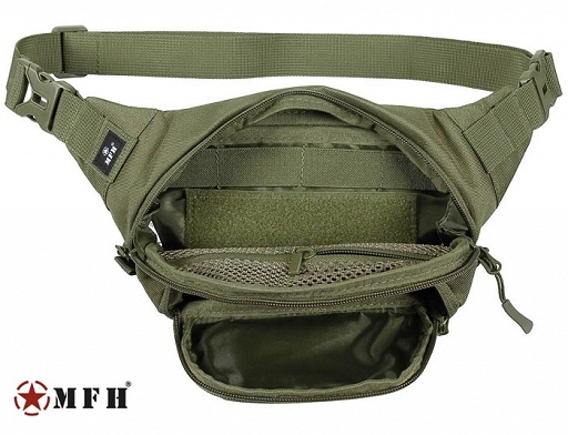 Komora główna z dwukierunkowym zamkiem błyskawicznym. Wewnątrz 1 kieszeń z siatki zapinana na zamek, panel na rzep i paski elastyczne do wsuwania płaskich przedmiotów. Przednia kieszeń z zamkiem błyskawicznym i zewnętrznym panelem na rzep (ok. 10 x 5 cm). Tylna kieszeń zapinana na zamek błyskawiczny. Pasek w talii z 2 zapięciami zatrzaskowymi, regulowany do całkowitej długości 120 cm (wraz z torbą).
