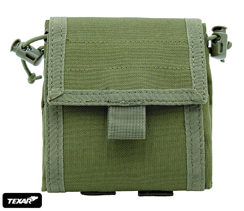 Worek składany, po złożeniu, włożony do zasobnika ma wymiary 13 x 13 cm. Zasobnik zamykany na rzep, z tyłu paski montażowe systemu Molle - można go przytroczyć do pasa lub innego wyposażenia z systemem Molle. Worek zamykany na elastyczny ściągacz ze stoperami.